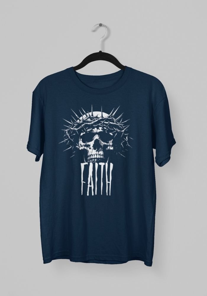 Design: Bold skull graphic with Faith text – edgy yet meaningful style