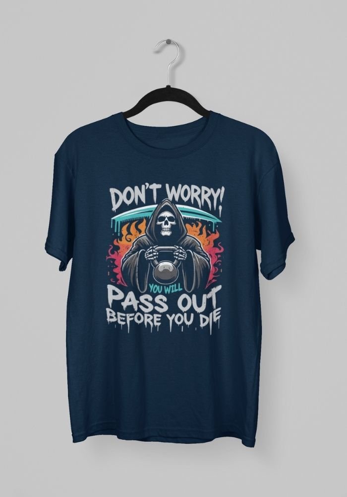 Design: Bold and humorous Don’t Worry You’ll Passout Before You Die text for a fun workout vibe