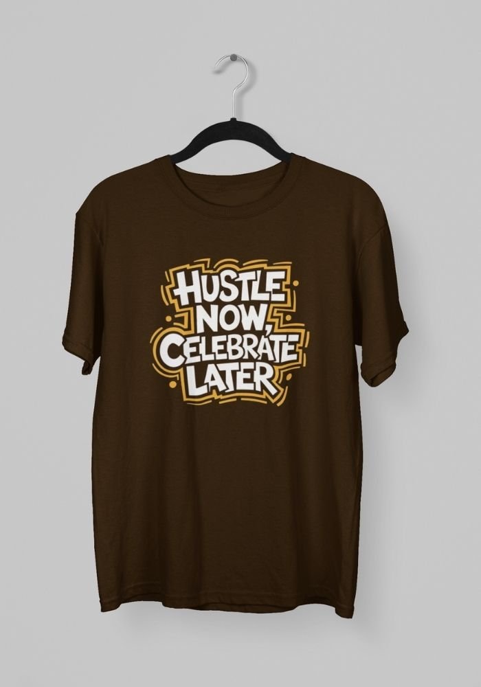 Keep pushing forward with the Kalavesh Hustle Now Celebrate Later T-Shirt. Featuring a bold motivational quote that inspires you to work hard and enjoy the rewards later, this tee is perfect for gym-goers, athletes, and anyone chasing their goals. Crafted from premium cotton and designed with a regular fit, it offers all-day comfort and style for intense workouts or casual wear. Available in vibrant colors to match your energy.